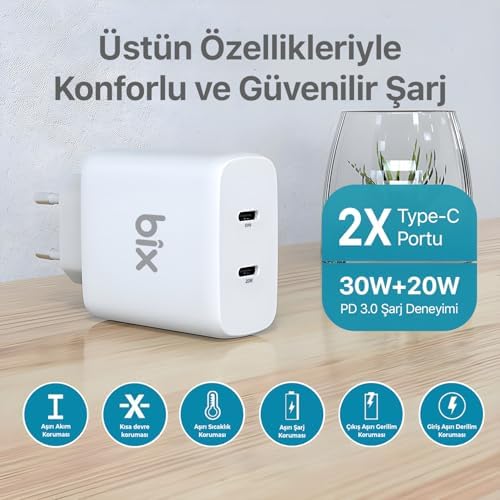 ✔ Çift Bağlantı Noktalı Type-C Duvar Şarj Cihazı ✔ 2* adet Type-C bağlantı noktası ile donatılmış Bix şarj adaptörü sayesinde Type-C cihazlarınızı aynı anda şarj edin. 2* Type-C girişinden birini kullanarak cihazınızı ister 30W ister 20W’lık giriş ile şarj edebilirsiniz. 2* Type-C portunu aynı anda kullanırsanız her iki bağlantı noktasının maksimum toplam çıkış gücü 50W'tır. ✔ Typ-C PD Hızlı Şarj Cihazı ✔ PD şarj cihazı, iPhone, iPad ve Type-C cihazlarının yüksek hızlı şarj edilmesi için maksimum 30W çıkış sağlar. Bekleme süresini en aza indirin ve çeşitli arayüzlerle sizi dağınık şarj cihazlarından kurtarın. 5W şarj cihazından 3 kata kadar daha hızlı ve verimli şarj sunar. iPhone 13'ünüzü orijinal kabloyla yalnızca 30 dakikada %50 kapasiteye kadar şarj edin ✔ Güvenli ve Güvenilir ✔ Sıcaklığı aktif olarak izleyen bir Dinamik Sıcaklık Sensörü ve bağlı cihazınızı korumak için güç çıkışını ayarlayan akıllı bir Çip içerir. Programlanabilir Güç Kaynağı (PPS), gelişmiş şarj teknolojisini ile cihazınızın şarj durumuna bağlı olarak maksimum gücü besleyerek voltaj ve akım gücünü gerçek zamanlı olarak değiştirebilir. ✔ Evrensel Uyumluluk ✔ PD şarj cihazı AirPods, iPhone 14/14 Plus/14 Pro/14 Pro Max, iPhone 13/13 Pro Max, iPhone 12/12 Mini/12 Pro/ 12 Pro Max, iPad Pro 11"2020, iPad Air 3 10.5". S22 Ultra/S22+/S22, S21 Ultra/S21+/S21, 12T Pro, Mi 11T Pro/11, Mi 10T Pro, Mi 11/11 Lite, Redmi Note 11 Pro/11, Redmi Note 10 Pro/10, Mate 50 Pro, P50 Pro, P40 Pro ve diğer tüm cihazlar ile uyumludur.ile uyumludur. , Realme ve daha fazlası. ✔ Kompakt ve Taşınabilir ✔ Kolay taşınabilir, küçük ve hafif; 55,23"x 52,28"x 27,69mm" boyutu ve 100V'tan 240V'a kadar geniş voltaj aralığı, onu seyahat için uygun hale getirir. ✔ 24 AY GARANTİ ✔ BİX ÜRÜNLERİNİN TAMAMI; ARIZA DURUMUNDA 24 AY KOŞULSUZ DEĞİŞİM VE GARANTİ KAPSAMINDADIR. BX2P50 50W PD 2*Type-C Girişli Gelişmiş Şarj Teknolojisi ile Donatılmış Seyahat Adaptörü