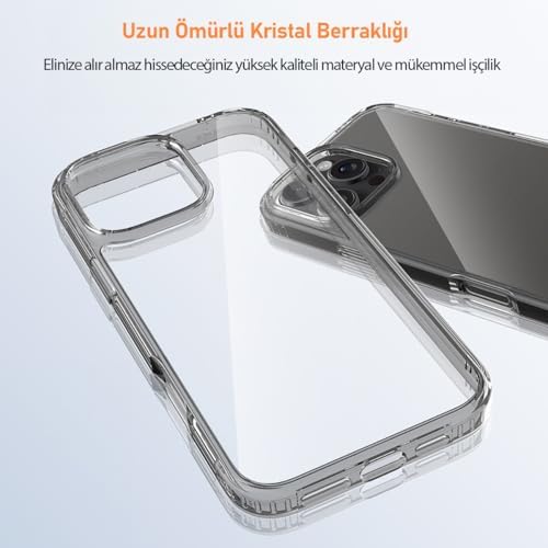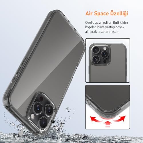Air Space Özelliği : Özel dizayn edilen Buff kılıfın köşeleri hava yastığı örnek alınarak tasarlanmıştır. Telefonların kırılmasına neden olan darbelerin yüzde doksanı köşelerden gelmektedir. Elinizden kayarak düşen cep telefonunuz, köşelerinde ki Air Space özelliği sayesinde artık kırılmayacak. Air Space Hava Yastığı teknolojisi ile özel dizayn edilen Buff kılıf dört köşeden düşmelere karşı üstün koruma sağlar. Ekran kenar payı ile cihazınız ekranı yüzey ile temas etmez ve çizilmere karşı cihazınızı korumaya yardımcı olur. 0.2 mm arka kamera dış kenar payı ile kameranız yüzey ile temas etmez ve çizilmesini engellemeye yardımcı olur Air Hybrid Polikarbon – TPU malzemeden yapılır. iPhone 16 Pro Max ile Uyumlu Air Hybrid Darbe Emici TPU ve PC Kılıf, Smoke Black