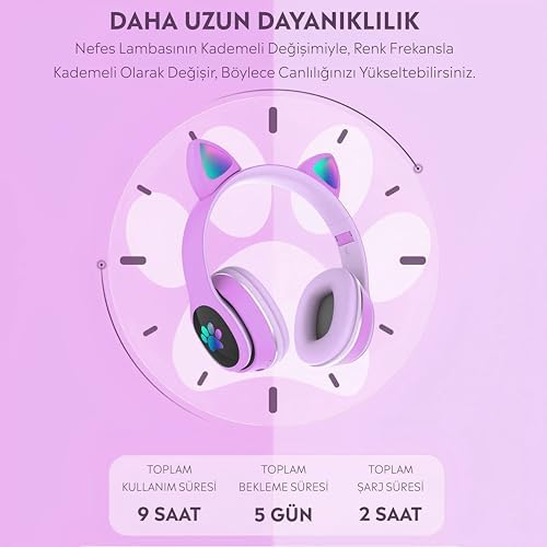 Kedi kulağı tasarımlı göz alıcı görünüm Renkli RGB led ışık aydınlatması Akıllı gürültü önleyici teknolojisi Konforlu ergonomik tasarım Şok ses efekti Led ışıklandırma Kedi Kulak Rgb Led Işıklı Kablosuz Bluetooth Kulaklık Mikronlu Hafıza Kartı Girişli Kedi Kulaklık (Lila)